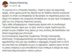 Μέσω ανάρτησης στον προσωπικό του λογαριασμό στο Facebook ο Πέτρος Κόκκαλης ανακοίνωσε πως παραιτείται άμεσα από τον συνδυασμό «Πειραιάς Νικητής». Λίγο νωρίτερα,...