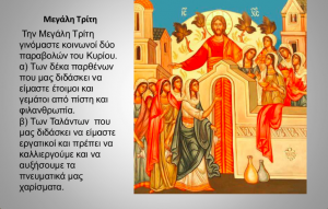 Τη Μεγάλη Τρίτη ενθυμούμαστε την παραβολή των Δέκα Παρθένων που έχει υψίστη σημασία για τη σωτηρία μας. Η Υμνογραφία της...