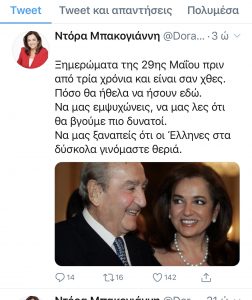 Σε ανάρτησή της στο Twitter για τα τρία χρόνια από το θάνατο του Κωνσταντίνου Μητσοτάκη η Ντόρα Μπακογιάννη αναφέρει: «Ξημερώματα...