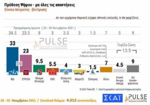 Δημοσκόπηση Pulse για το Skai (25/11/2021) ΝΔ 33% / ΣΥΡΙΖΑ 23% / ΚΙΝΑΛ 9,5% / ΚΚΕ με 5,5% /Ελλ. Λύση...