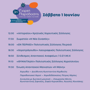 Η Ένωση Απανταχού Μανιατών «Η Μάνη» διοργανώνει και σας προσκαλεί στην 3η Γιορτή Παράδοσης, που θα πραγματοποιηθεί το Σάββατο 1...