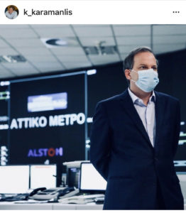 Φωτογραφία του φορώντας μάσκα μπροστά από το Κέντρο Συντονισμού του Μετρό ανάρτησε στο Facebook ο υπουργός Υποδομών και Μεταφορών Κώστας...