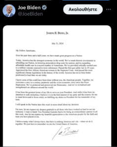 Αναλυτικά το κείμενό του Μπάιντεν για την αποχώρηση του από την κούρσα «Συμπατριώτες μου Αμερικανοί, Τα τελευταία τριάμισι χρόνια, έχουμε...