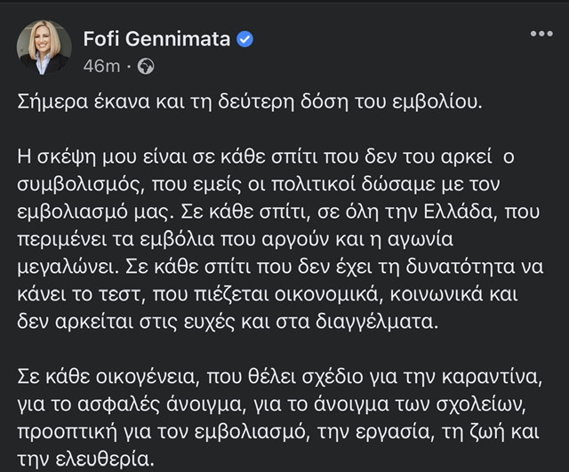 “Σήμερα έκανα και τη δεύτερη δόση του εμβολίου.