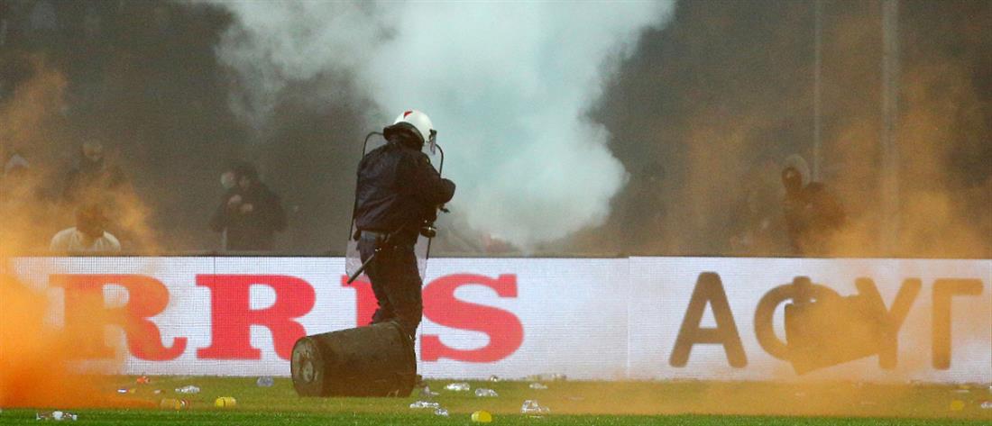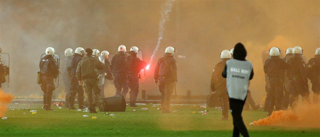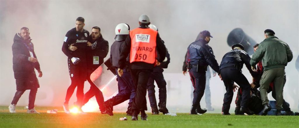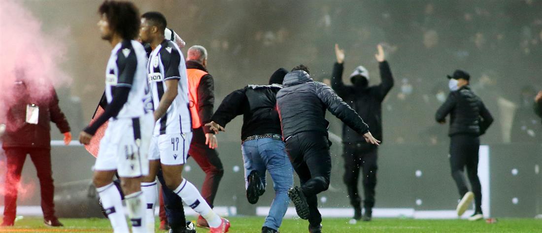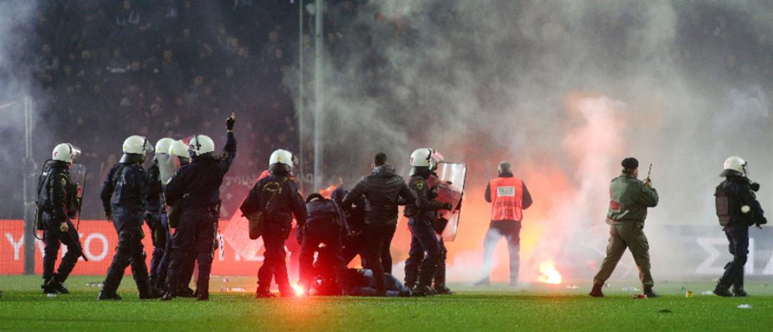 Άλλη μια μέρα ντροπής στον ελληνικό αθλητισμό όταν οπαδοί του «Δικέφαλου» πέταξαν δεκάδες αντικείμενα, φωτοβολίδες και τελικά εισέβαλαν στον αγωνιστικό χώρο, με αποτέλεσμα τη διακοπή της συνάντησης.