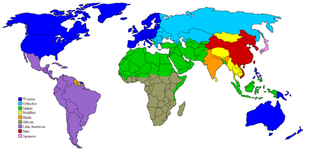 Ο περιβόητος χάρτος των πολιτισμών του Huntington. Η διάκριση δυτικού και ορθοδόξου πολιτισμού, όπως και η συμπερίληψη της Ελλάδος στον δεύτερο, προκάλεσε σφοδρή κριτική.