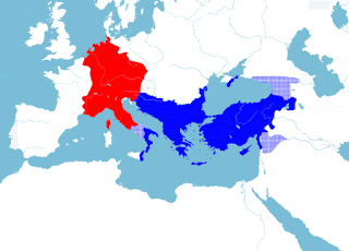 Τα δύο τμήματα της Ρωμαϊκής αυτοκρατορίας το 395. Η κατάρρευση του δυτικού προκάλεσε κενό ισχύος και νομιμοποιούσας τάξεως στην Ευρώπη, με αποτέλεσμα το κενό να επιχειρήσει να καλύψει ο πάπας και οι Φραγκο-Γερμανοί.