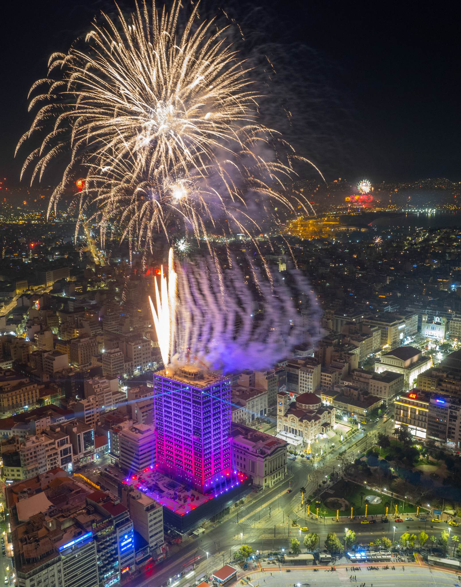 Από το δεύτερο ψηλότερο κτήριο στην Ελλάδα, λίγα λεπτά πριν από την έλευση του νέου έτους δόθηκε το σύνθημα της αντίστροφης μέτρησης, σκορπίζοντας λάμψη στην πόλη και τη θάλασσα του Πειραιά, στέλνοντας μηνύματα χαράς, ελπίδας και αισιοδοξίας για το 2023.