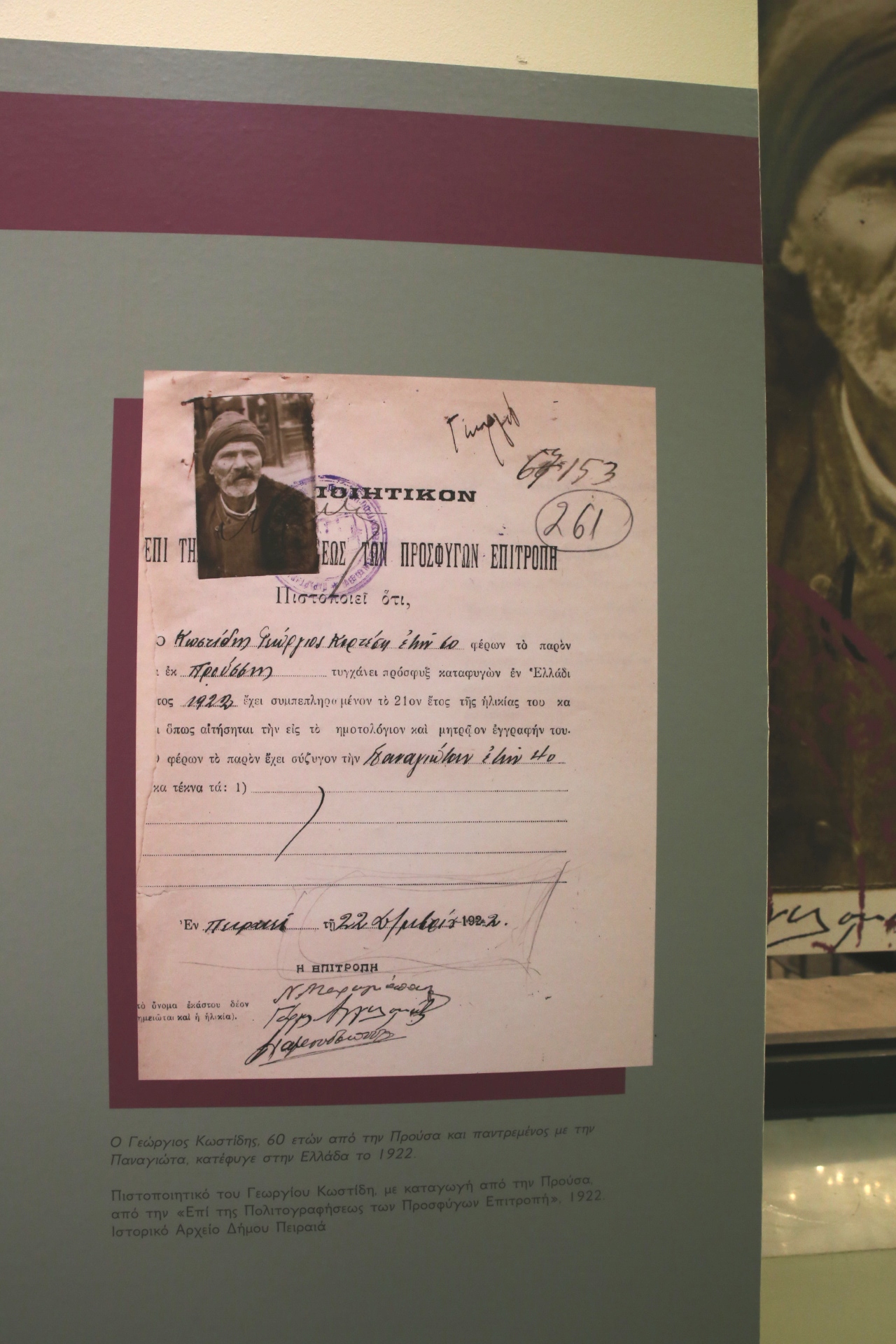 «Το Ιστορικό Αρχείο, σε συνεργασία με τη Δημοτική Βιβλιοθήκη και τη Δημοτική Πινακοθήκη της Διεύθυνσης Πολιτισμού του Δήμου Πειραιά, παρουσιάζει την έκθεση: «Πειραιάς, 1922: τεκμήρια προσφυγιάς».