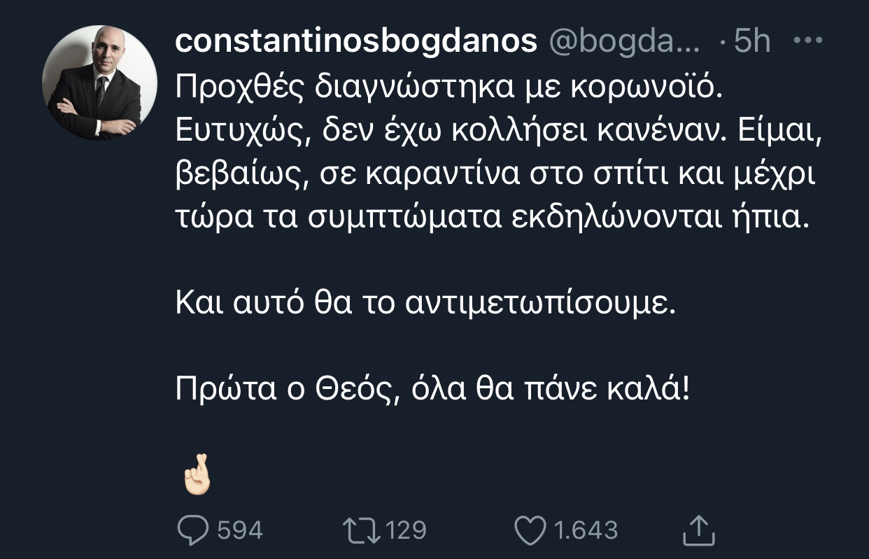 Όπως ενημέρωσε μέσω ανάρτησή του στο twitter διαγνώσθηκε χθες με κορονοϊό και βρίσκεται σε καραντίνα στο σπίτι του, με ήπια συμπτώματα.