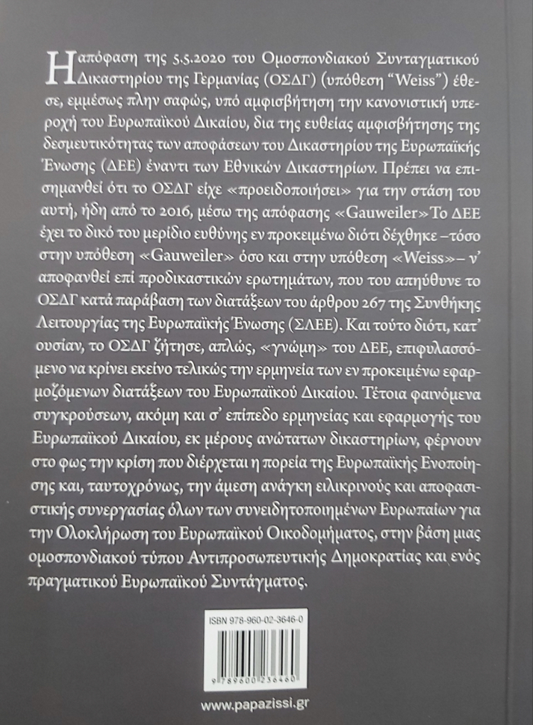 Η απόφαση της 5.5.2020 του Ομοσπονδιακού Συνταγματικού Δικαστηρίου της Γερμανίας (ΟΣΔΓ) (υπόθεση “Weiss”) έθεσε, εμμέσως πλην σαφώς, υπό αμφισβήτηση την κανονιστική υπεροχή του Ευρωπαϊκού Δικαίου, δια της ευθείας αμφισβήτησης της δεσμευτικότητας των αποφάσεων του Δικαστηρίου της Ευρωπαϊκής Ένωσης (ΔΕΕ) έναντι των Εθνικών Δικαστηρίων. Πρέπει να επισημανθεί ότι το ΟΣΔΓ είχε «προειδοποιήσει» για την στάση του αυτή, ήδη από το 2016, μέσω της απόφασης «Gauweiler». Το ΔΕΕ έχει το δικό του μερίδιο ευθύνης εν προκειμένω διότι δέχθηκε -τόσο στην υπόθεση «Gauweiler» όσο και στην υπόθεση «Weiss»– ν’ αποφανθεί επί προδικαστικών ερωτημάτων,που του απηύθυνε το ΟΣΔΓ κατά παράβαση των διατάξεων του άρθρου 267 της Συνθήκης Λειτουργίας της Ευρωπαϊκής Ένωσης (ΣΛΕΕ). Και τούτο διότι, κατ’ ουσίαν, το ΟΣΔΓ ζήτησε, απλώς, «γνώμη» του ΔΕΕ, επιφυλασσόμενο να κρίνει εκείνο τελικώς την ερμηνεία των εν προκειμένω εφαρμοζόμενων διατάξεων του Ευρωπαϊκού Δικαίου. Τέτοια φαινόμενα συγκρούσεων,ακόμη και σ’ επίπεδο ερμηνείας και εφαρμογής του Ευρωπαϊκού Δικαίου, εκ μέρους ανώτατων δικαστηρίων, φέρνουν στο φως την κρίση που διέρχεται η πορεία της Ευρωπαϊκής Ενοποίησης και, ταυτοχρόνως, την άμεσηανάγκη ειλικρινούς και αποφασιστικής συνεργασίας όλων των συνειδητοποιημένων Ευρωπαίων για την Ολοκλήρωση του Ευρωπαϊκού Οικοδομήματος, στην βάση μιας ομοσπονδιακού τύπου Αντιπροσωπευτικής Δημοκρατίας και ενός πραγματικού Ευρωπαϊκού Συντάγματος.