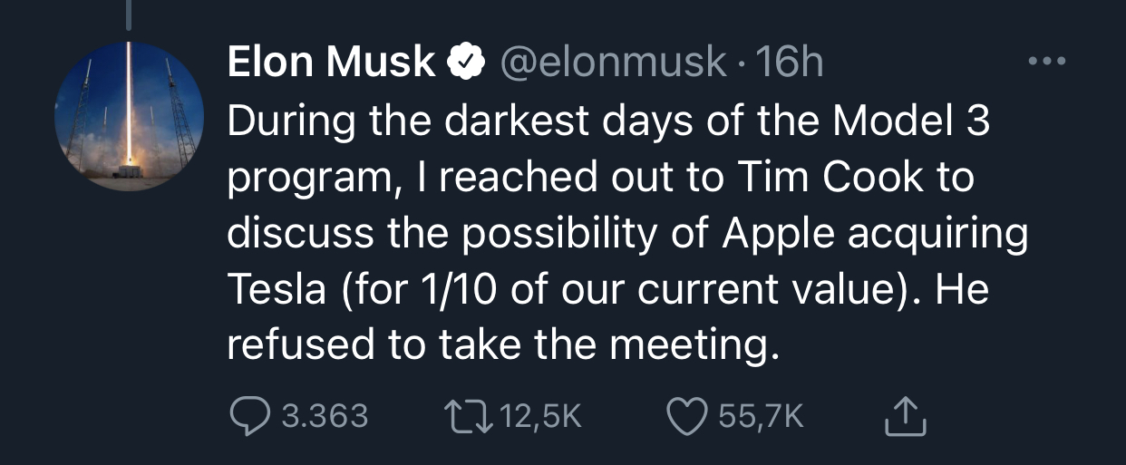 Η είδηση πως η Apple ετοιμάζει το δικό της ηλεκτρικό αυτοκίνητο ξεκίνησε και πάλι μία ευρεία συζήτηση γύρω από τις δυνατότητες της εταιρίας για ένα τέτοιο εγχείρημα. Απαντώντας λοιπόν σε ένα σχετικό tweet, ο Elon Musk αποκάλυψε στο Twitter πως κάποια στιγμή, προσπάθησε να πουλήσει την Tesla στην Apple, αλλά ο Tim Cook δε δέχθηκε ούτε καν να τον συναντήσει. Το περιστατικό έλαβε χώρα όταν η Tesla είχε την υποδεκαπλάσια αξία σε σχέση με σήμερα και περνούσε τις πιο “σκοτεινές” της μέρες.
