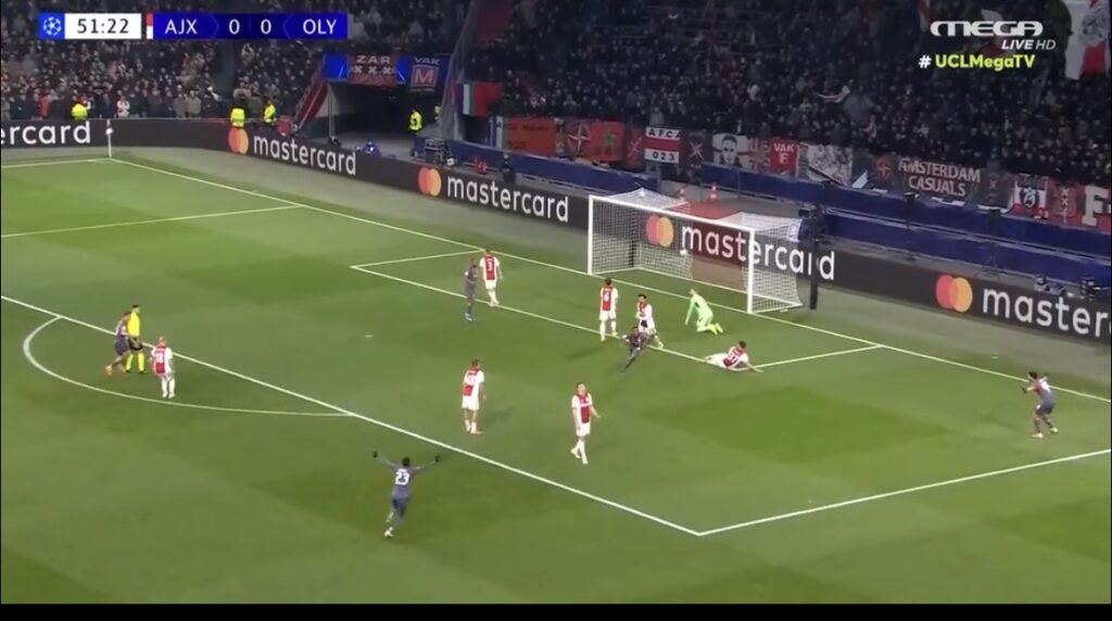 Ο Ολυμπιακός στάθηκε τυχερός στο πρώτο ημίχρονο, καθώς ο Άγιαξ ήταν ανώτερος και απείλησε άμεσα την εστία του Τζολάκη. Στο 25΄ ο Γκλουκ έχασε το… άχαστο σε σουτ μέσα από τη μικρή περιοχή και τον «ερυθρόλευκο» γκολκίπερ εξουδετερωμένο. Στο 32΄ ακυρώθηκε ως (οριακό) οφσάιντ ένα γκολ του Ντόλμπεργκ, ενώ στις καθυστερήσεις (45+3΄) ο Μπιανκόν στην προσπάθειά του να απομακρύνει έδιωξε τη μπάλα με το χέρι μέσα στην περιοχή. Ωστόσο, διαιτητής και VAR θεώρησαν ότι δεν υπήρξε παράβαση δεδομένου ότι πρώτα βρήκε τη μπάλα με το πόδι κι έτσι δεν καταλογίστηκε πέναλτι.