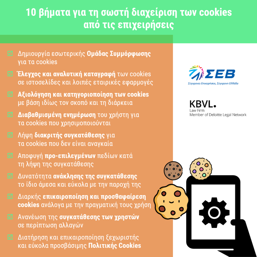 Ο ΣΕΒ και η KBVL Δικηγορική Εταιρεία, Μέλος του Δικτύου Deloitte Legal,συνεργάστηκαν για την έκδοση του «Πρακτικού οδηγού συμμόρφωσης για τη χρήση cookies» που δημοσιοποιείται σήμερα, Τετάρτη, 26.08.2020,με σκοπό να αποτελέσει μια χρήσιμη πηγή πρακτικής πληροφόρησηςγια την ενίσχυση των ψηφιακών σχέσεων των επιχειρήσεων με τους καταναλωτές και την ενδυνάμωση της ψηφιακής τους παρουσίας. Ο Οδηγός απευθύνεται σε όλες τις επιχειρήσεις και στόχος του είναι να βοηθήσει με όσο το δυνατόν πιο πρακτικό τρόπο στη συμμόρφωση ως προς τη σωστή χρήση και διαχείριση των cookies, που είναι βασική προϋπόθεση για τη νόμιμη επεξεργασία των ψηφιακών δεδομένων, προσωπικών και μη.Η έκδοσή του, η οποία αποτελεί συνέχεια της πρόσφατης έκδοσης «E-commerce: πρακτικός οδηγός για σωστή επικοινωνία των επιχειρήσεων με τους καταναλωτές», εντάσσεται στο πλαίσιο της πρωτοβουλίας διαρκείας του ΣΕΒ για τον ψηφιακό μετασχηματισμό και την ενδυνάμωση των επιχειρήσεων στην πορεία προσαρμογής τους στην ψηφιακή εποχή και στο ηλεκτρονικό επιχειρείν.