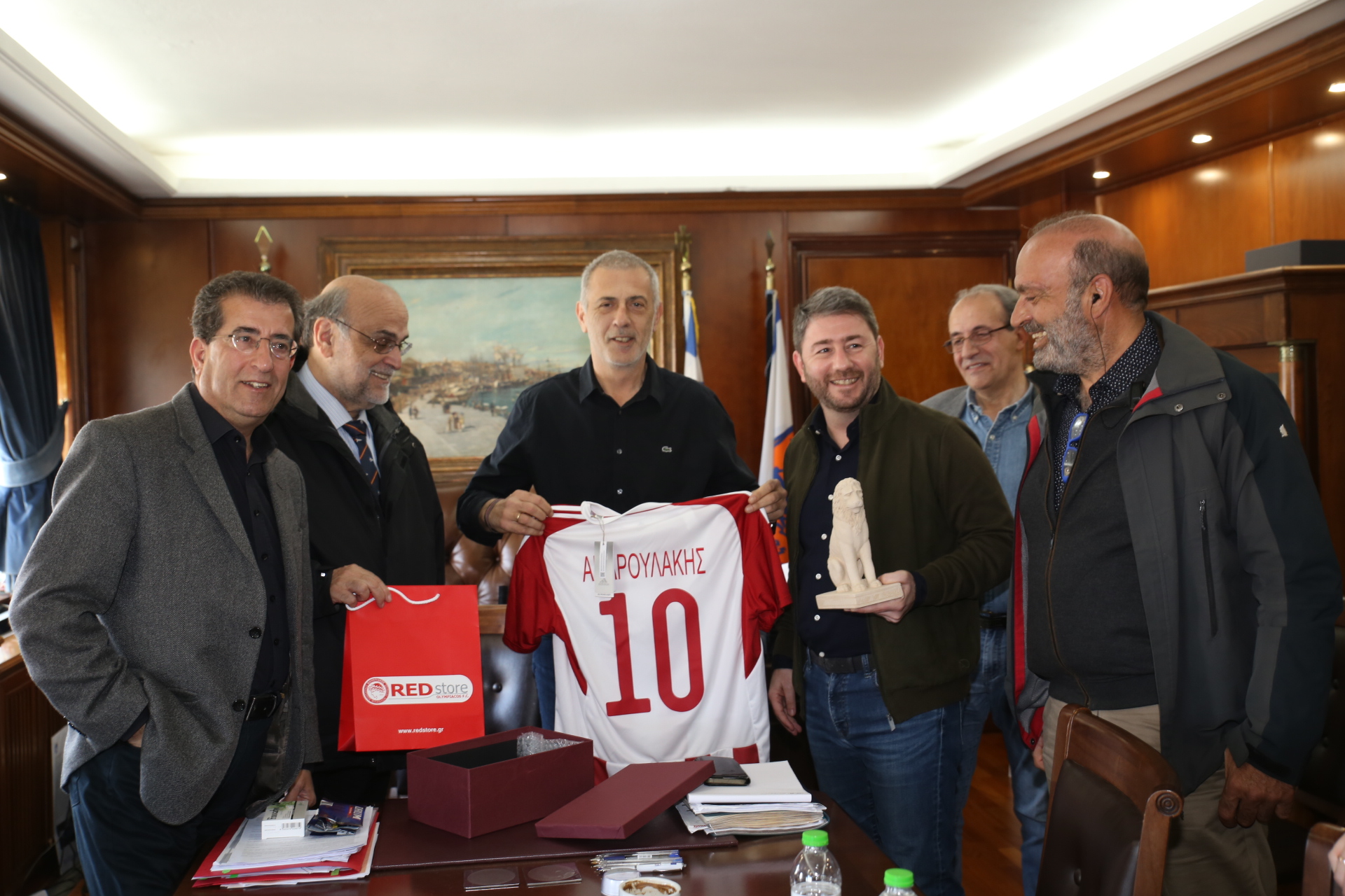 κ. Ανδρουλάκη μια μινιατούρα του Λέοντος του Πειραιά και μια φανέλα του Ολυμπιακού για τον γιο του, ο οποίος είναι φίλαθλος του Ολυμπιακού.