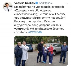 Επισκέφτηκα το νοσοκομείο αναφοράς «Σωτηρία» και μίλησα μέσω ενδοεπικοινωνίας, με τους δύο Έλληνες που επαναπατρίστηκαν την περασμένη Κυριακή από την...