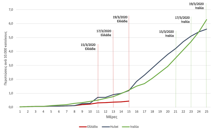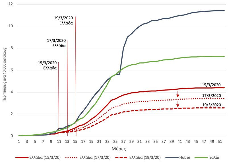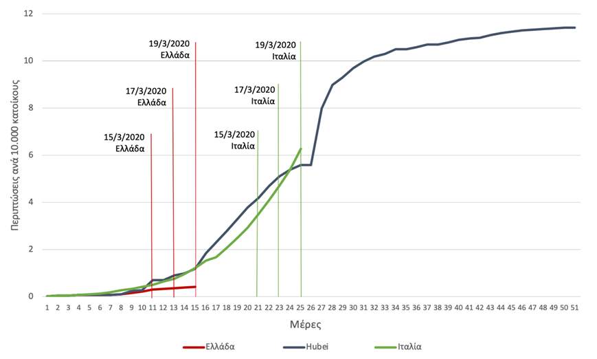 - Η πραγματικότητα μέχρι σήμερα αποδεικνύει ότι η παραπάνω υπόθεση δεν είναι ορθή διότι και η Hubei και η Ιταλία και η Ελλάδα εισήγαγαν πολιτικές περιορισμού του φαινομένου σε διαφορετικές χρονικές στιγμές και με διαφορετικές ποιότητες εφαρμογής. Για αυτό εξάλλου μέχρι σήμερα οι εξελίξεις δεν είναι παρόμοιες.
