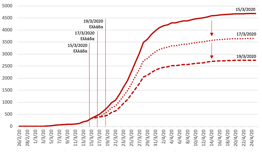 - Με βάση τα ευρήματα αυτά η χειρότερη περίοδος κοινωνικού πόνου για την Ελλάδα είναι το διάστημα που περιλαμβάνεται μέχρι το τέλος αυτής της εβδομάδας ενώ εκτείνεται μέχρι την πρώτη βδομάδα του Απριλίου επειδή οι αριθμοί των νέων κρουσμάτων θα είναι μεγάλοι αν και ο ρυθμός μεγέθυνσής τους θα μειώνεται (βλέπε Διάγραμμα 5).