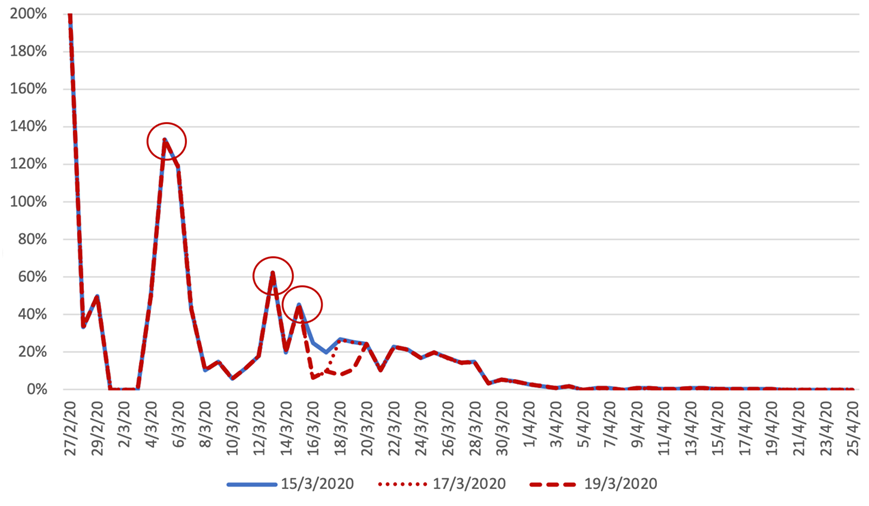 Διάγραμμα 5. Ποσοστιαία μεταβολή κρουσμάτων στην Ελλάδα όταν η εξέλιξη του φαινομένου είναι παράλληλη με αυτή της Ιταλίας