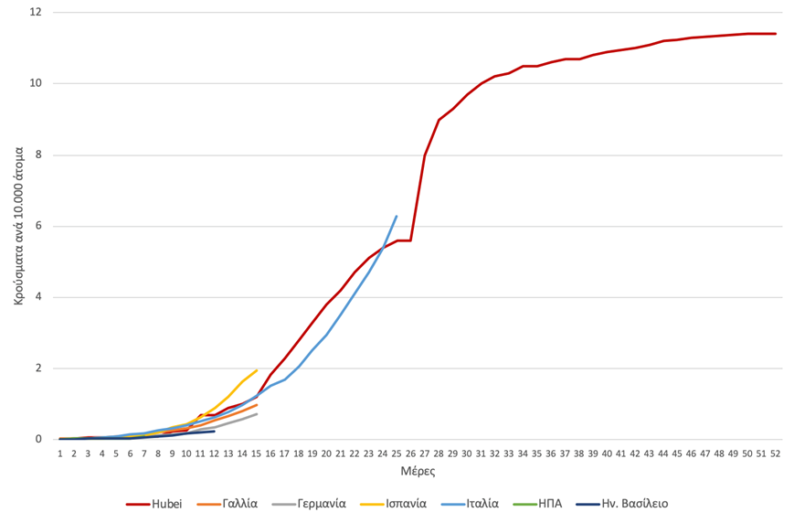 Σημείωση: Η μέρα 1 είναι η μέρα με την εμφάνιση 100 κρουσμάτων ανά 60 εκατομμύρια πληθυσμού. Για την Ιταλία η μέρα αυτή είναι η 24η Φεβρουαρίου, για τις Γαλλία, Γερμανία και Ισπανία η 3η Μαρτίου, για το Ην. Βασίλειο η 6η Μαρτίου και για τις ΗΠΑ η 11η Μαρτίου.
